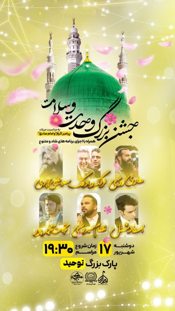 رمضانی ادامه داد: همزمان با شب میلاد رسول اکرم(ص) و امام جعفر صادق(ع) در محل فرهنگسرای شهرداری، جشن بزرگی با حضور هنرمندان کشوری و استانی برگزار خواهد شد.