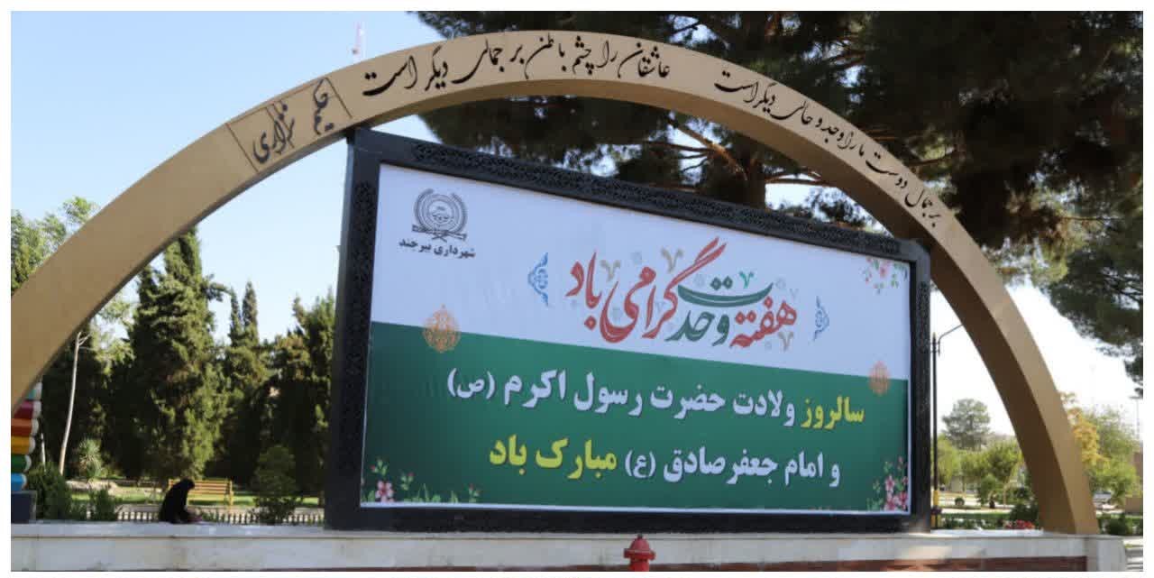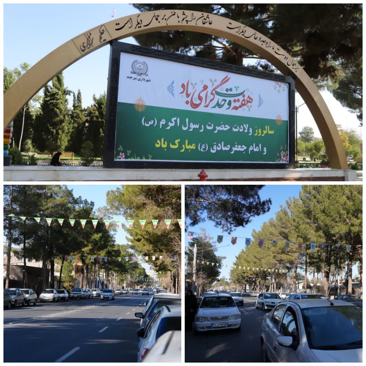 وی از آذین بندی سطح شهر با نصب ۲ هزار پرچم رنگی در میادین و معابر اصلی شهر، نصب چند کتیبه بزرگ در میادین اصلی و اهتزاز پرچم بزرگ «محمد رسولالله(ص)» بر فراز فرهنگسرای شهرداری، به عنوان بخشی از اقدامات شهرداری بیرجند برای گرامیداشت ایام هفته وحدت، نام برد.